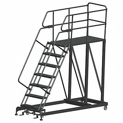 Single Access Rolling Platform Material Steel Platform Style Single Access Platform Height 70 in Load Capacity 800 lb Base Depth 97 in Bottom Width 38 in Platform Depth 60 in Platform Width 36 in Overall Height 9 ft 1 in Handrail Height 36 in Number of Guard Rails 3 Number of Legs 2 Number of Steps 7 Step Width 36 in Step Depth 7 in Climbing Angle 59 Degrees Step Tread Serrated Color Gray Finish Powder Coated Standards OSHA and ANSI Includes Lockstep and Handrails