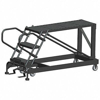Single Access Rolling Platform Material Steel Platform Style Single Access Platform Height 30 in Load Capacity 800 lb Base Depth 60 in Bottom Width 33 in Platform Depth 48 in Platform Width 24 in Overall Height 2 ft 6 in Number of Legs 2 Number of Steps 3 Step Width 24 in Step Depth 7 in Climbing Angle 59 Degrees Step Tread Serrated Color Gray Finish Powder Coated Standards OSHA and ANSI Includes Lockstep and Push Rails Manufacturers Warranty Length 1 yr