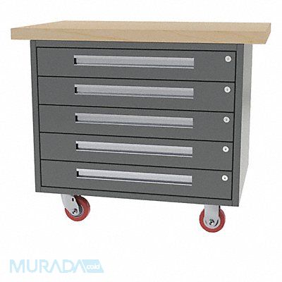 Mobile Cabinet Workbench Top Material Butcher Block Color Gray Non-Metal Top Thickness 1 3/4 in Number of Doors 0 Number of Drawers 5 Number of Shelves 0 Overall Depth 28 in Overall Height 34 in Overall Load Capacity 2 500 lb Overall Width 38 in Top Metal Material Gauge Not Applicable Included Components No Additional Components Assembly Fully Assembled Brake Type Wheel Brake Cabinet Interior Depth 22 in Caster Mount Type Plate Caster Type (2) Rigid (2) Swivel with Brakes