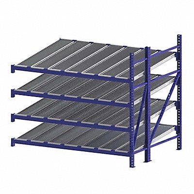 Gravity Flow Rack 3 000 lb Load Capacity per Shelf Tilted Shelf Angle 14 ga Shelf Gauge Add-On Shelving Configuration Number of Shelves 4 Decking Finish Powder Coated Decking Material Steel Roller Track Decking Style Depth per Side 72 in Powder Coated Steel Blue Overall Depth 72 in Overall Height 84 in Overall Width 96 in 12 ga Post Gauge 12 000 lb Whole Unit Load Capacity Assembled Unassembled Labels Post Caps Touch Up Marker Boltless