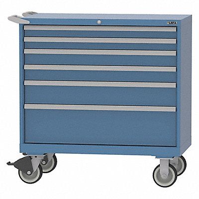 Modular Drawer Cabinet Base Type Casters Adjustable Dividers Yes Cabinet Color Bright Blue Cabinet Storage Components Drawers Drawer Height 2 in 3 in 5 in 9 in Includes Dividers No Number of Compartments per Drawer Not Applicable Number of Drawers 6 Overall Depth 22 1/2 in Overall Height 43 1/4 in Overall Width 40 1/4 in Mobility Mobile Cabinet Finish Powder Coated Cabinet Material Steel Caster Wheel Diameter 6 in Drawer Access Single Drawer Depth 18 in