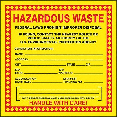 Hazardous Waste Labels Language English Handling Label/Placard Type Waste DOT/UN Product Form Label Message Federal Laws Prohibit Improper Disposal If Found Contact The Nearest Police or Public Safety Authority or The U.S. Environmental Protection Agency Generator Information Handle With Care Label Width 6 in Label Height 6 in Material Vinyl Labels per Roll 250 Background Color Yellow Package Quantity 250