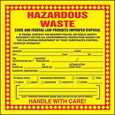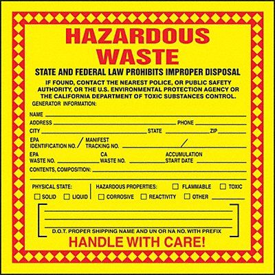 Hazardous Waste Labels for California Language English Handling Label/Placard Type Waste DOT/UN Product Form Label Message State and Federal Laws Prohibit Improper Disposal If Found Contact the Nearest Police or Public Safety Authority or The U.S. Environmental Protection Agency or The California Department of Toxic Substance Control Generator s Information Physical Stat Label Width 6 in Label Height 6 in Material Vinyl Labels per Roll 25 Background Color Yellow