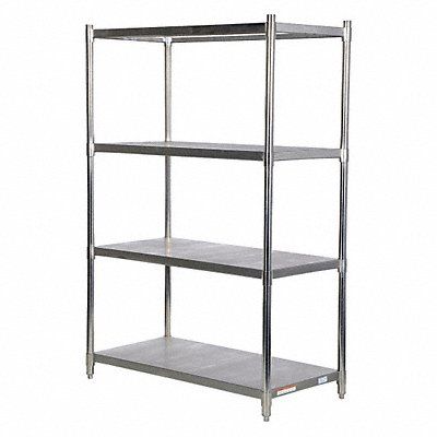 Metal Shelving Silver Frame Material Stainless Steel Load Capacity per Shelf 600 lb Whole Unit Load Capacity 2 400 lb Number of Shelves 4 Overall Depth 24 in Overall Height 72 in Overall Width 48 in Post Construction Round Shelf Configuration Standalone Shelf Style Solid Shelving Material Stainless Steel Assembled Unassembled Shelving Gauge 18 ga Post Gauge 18 ga Shelf Adjustment Increments 1 1/2 in Mounting Hardware Required Yes Number of Drawers 0 Duty Rating Medium-Duty