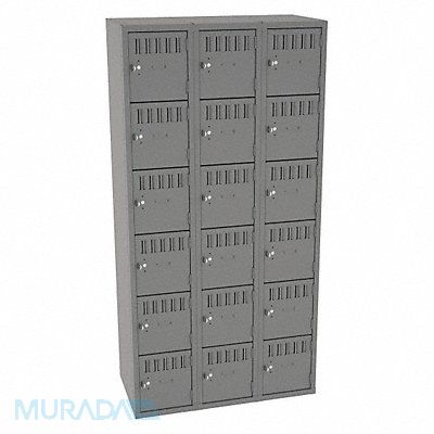 Box Locker Audit Trail Storage None Frame Assembled Assembled Number of Tiers 6 Number of Units Wide 3 Door Type Louvered Frame Material Thickness 16 ga Includes Number Plates Yes Locker Color Gray Lock Type Padlock Hasp Overall Depth 18 in Overall Height 72 in Overall Width 36 in Handle Type Pull Includes ID Plate Locker Material Steel Number of Lockers 18 Opening Depth 16 7/8 in Opening Height 10 5/8 in Opening Width 9 5/8 in