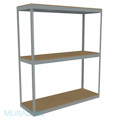 Boltless Shelving Angle Overall Depth 24 in Overall Height 84 in Overall Width 72 in Shelf Gauge 14 ga Shelf Adjustment Increments 1 1/2 in Steel Particleboard Steel (3) Deck Levels (4) Posts Includes Decking Yes 1 750 lb Whole Unit Load Capacity 5 250 lb Starter Open Post Gauge 14 ga Number of Shelves 3 Maximum Post Load Capacity 8 000 lb with Beams Evenly Spaced at 24 in Powder Coated Heavy-Duty Gray