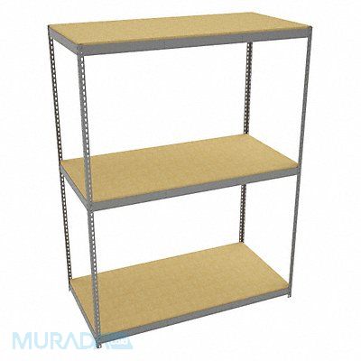 Boltless Shelving Angle Overall Depth 36 in Overall Height 96 in Overall Width 72 in Shelf Gauge 14 ga Shelf Adjustment Increments 1 1/2 in Steel Particleboard Steel (3) Deck Levels (4) Posts Includes Decking Yes 1 750 lb Whole Unit Load Capacity 5 250 lb Starter Open SCS Indoor Advantage(R) Certified Post Gauge 14 ga Number of Shelves 3 Maximum Post Load Capacity 8 000 lb with Beams Evenly Spaced at 24 in Powder Coated Heavy-Duty Gray
