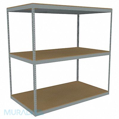 Boltless Shelving Angle Overall Depth 48 in Overall Height 84 in Overall Width 96 in Shelf Gauge 14 ga Shelf Adjustment Increments 1 1/2 in Steel Particleboard Steel (12) Beams (4) Posts Includes Decking Yes 1 250 lb Whole Unit Load Capacity 3 750 lb Starter Open Post Gauge 14 ga Number of Shelves 3 Maximum Post Load Capacity 8 000 lb with Beams Evenly Spaced at 24 in Powder Coated Heavy-Duty Gray