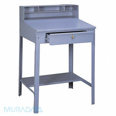 Shop Desk Number of Doors 0 Number of Shelves 1 Desk Color Gray Desk Style Open-Base Includes Keyboard Tray No Mobility Stationary Number of Compartments 4 Number of Drawers 1 Overall Depth 29 in Overall Height 53 in Overall Width 34 1/2 in Shelf Depth 9 in 15 in Shelf Width 34 1/2 in Writing Surface Height from Ground 43 in Writing Surface Slope 6 Degrees Caster Type Not Applicable Caster Wheel Diameter Not Applicable Desk Material Steel