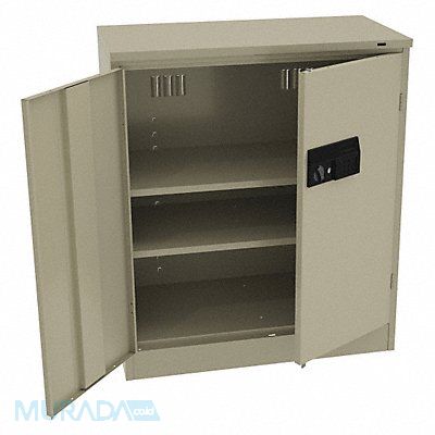Storage Cabinet Base Type Leveling Body Panel Type Solid Cabinet Color Sand Cabinet Material Steel Cabinet Storage Components Shelves Door Handle Type Recessed Pull Door Type Solid Duty Rating Medium Duty For Use Indoors/Outdoors No Frame Assembled Assembled Load Capacity per Shelf 200 lb Lock Type Electronic Keypad Mobility Stationary Mounting Location Freestanding Number of Shelves 2 Overall Depth 18 in Overall Height 42 in Overall Width 36 in Cabinet Finish Powder Coated