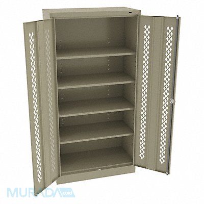 K3838 Storage Cabinet Base Type Frame Body Panel Type Ventilated Cabinet Color Sand Cabinet Material Steel Door Handle Type Swing Door Type Ventilated Duty Rating Light Duty Frame Assembled Assembled Load Capacity per Shelf 200 lb Lock Type Keyed Mobility Stationary Number of Shelves 4 Overall Depth 18 in Overall Height 72 in Overall Width 36 in Audit Trail Storage None Cabinet Finish Powder Coated Number of Doors 2 Panel Material Thickness 24 ga Shelf Adjustability Adjustable