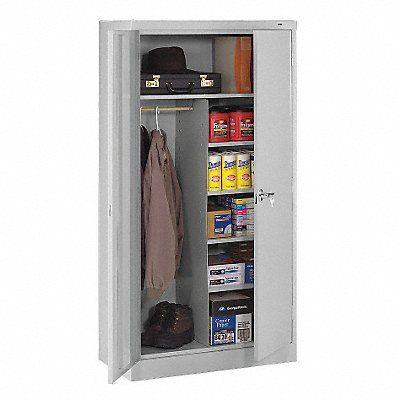 Storage Cabinet Base Type Frame Body Panel Type Solid Cabinet Color Light Gray Cabinet Material Steel Cabinet Storage Components Hanging Rods Shelves Door Handle Type Swing Door Type Solid Duty Rating Light Duty For Use Indoors/Outdoors No Frame Assembled Assembled Load Capacity per Shelf 150 lb Lock Type Keyed Mobility Stationary Mounting Location Freestanding Number of Shelves 5 Overall Depth 18 in Overall Height 72 in Overall Width 36 in Audit Trail Storage None