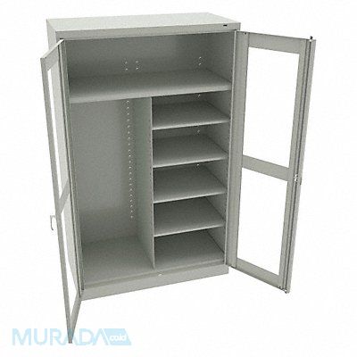 Storage Cabinet Base Type Leveling Body Panel Type Solid Cabinet Color Light Gray Cabinet Material Steel Cabinet Storage Components Hanging Rods Shelves Door Handle Type Swing Door Type Clearview Duty Rating Medium Duty For Use Indoors/Outdoors No Frame Assembled Assembled Load Capacity per Shelf 400 lb Lock Type Keyed Mobility Stationary Mounting Location Freestanding Number of Shelves 5 Overall Depth 24 in Overall Height 78 in Overall Width 48 in Audit Trail Storage None