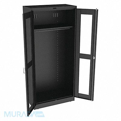 Storage Cabinet Base Type Leveling Body Panel Type Solid Cabinet Color Black Cabinet Material Steel Cabinet Storage Components Hanging Rods Shelves Door Handle Type Swing Door Type Clearview Duty Rating Medium Duty For Use Indoors/Outdoors No Frame Assembled Assembled Load Capacity per Shelf 150 lb Lock Type Keyed Mobility Stationary Mounting Location Freestanding Number of Shelves 1 Overall Depth 18 in Overall Height 78 in Overall Width 36 in Audit Trail Storage None