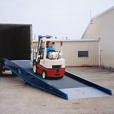 Portable Yard Ramp Load Capacity 16 000 lb Overall Length 30 ft Overall Width 70 in Usable Width 64 in Raised Height 72 in Lowered Height 40 in 8 in Side Rail Height Material Steel Steel Grating Deck Includes 16 in Lip on Carrier End Treadplate Full Undercarriage with Solid 18 in Rubber Tires Safety Chains to Secure Yard Ramp Double-Acting Hydraulic Pump to Adjust the Portable Units