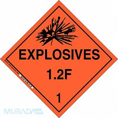 DOT Container Placard Language English Container Label/Placard Type Hazardous Class Hazard Class Class 1 (Explosives) DOT/UN Product Form Placard Message Explosives 1.2F 1 Label Width 10 3/4 in Label Height 10 3/4 in Material B-946 Pressure Sensitive Vinyl