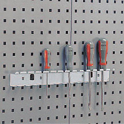 Screwdriver Holder Number of Hooks 1 Overall Height 1 1/2 in Overall Length 3/4 in Overall Width 17 3/4 in 3/4 in Hook Depth 1 1/2 in For Pegboard Hole Spacing For Pegboard Hole Size 3/8 in For Tool Type Screwdrivers Surface Locking Clip Locking System Circle For Pegboard Hole Shape Steel Gray Powder Coated Toolholder Accessory Type Screwdriver Rack
