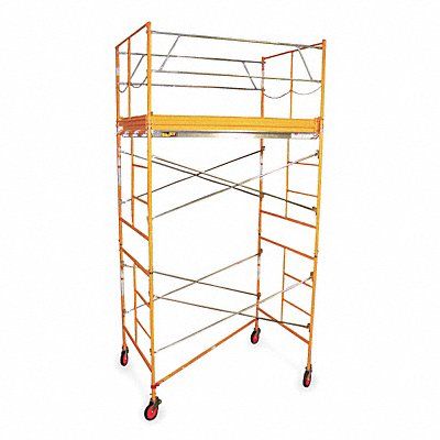 Scaffold Tower Overall Depth 60 in Overall Width 84 in Overall Height 17 ft Load Capacity 2 000 lb Material Steel/Plastic Max Work Height 17 ft Platform Height 2 to 11 ft Caster Dia 8 in Finish Yellow Powder Coated Standards ANSI Includes Guardrails Frames Braces Platform and Casters