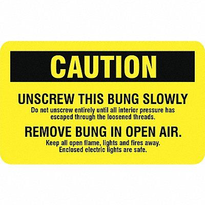 DOT Handling Label Language English Handling Label/Placard Type Hazardous Class DOT/UN Product Form Label Message Caution Unscrew this Bung Slowly Label Width 3 in Label Height 5 in Material Self-Sticking Vinyl Labels per Roll 250