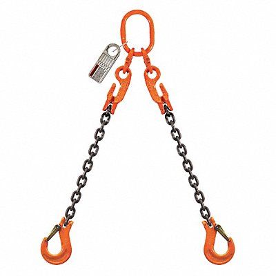 Chain Sling Grade 100 Number of Sling Legs 2 Chain Size 3/8 in Sling Capacity @ 30 Degrees 8 800 lb Sling Capacity @ 45 Degrees 12 400 lb Sling Capacity @ 60 Degrees 15 200 lb Sling Type Adjustable Oblong Sling Hook Hook Opening 1 7/32 in Master Link/Bail Opening Height 6 1/4 in Master Link/Bail Opening Width 3 1/2 in Color Black Orange Finish Painted Sling Length 10 ft Standards ASTM 952/A952M-02 for proof force ASTM A906/A906M-02