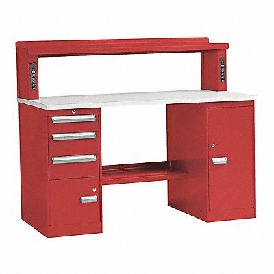 Workbench Height Adjustability Fixed Height Top Material Laminate Assembly Unassembled Color Red Frame Material Steel Leg Type Pedestal Cabinet Base Maximum Adjustable Height Not Applicable Minimum Adjustable Height Not Applicable Non-Metal Top Thickness 1 1/4 in Number of Drawers 3 Included Components Lower Shelf Riser Number of Shelves 2 Overall Depth 30 in Overall Fixed Height 33 1/2 in Overall Load Capacity 200 lb Overall Width 72 in Standards UL Listed