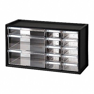 Drawer Bin Cabinet Cabinet Color Black Cabinet Material Polystyrene Drawer Color Clear Drawer HxWxD (1) 1 1/2 in x 8 3/4 in x 6 1/4 in (10) 1 1/2 in x 3 1/2 in x 6 1/4 in (2) 13 5/16 in x 8 3/4 in x 6 1/4 in Drawer Material Polystyrene ESD Conductive No Number of Dividers 10 Number of Drawers 13 Overall Depth 7 in Overall Height 9 3/4 in Overall Width 17 3/4 in Stackable Yes Divider Adjustment Increments 3/16 in Adjustable Dividers Yes Cabinet Storage Components Drawers
