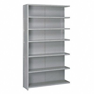 Steel Clip Adjustable Shelving Dove Gray Powder Coated Frame Material Steel Load Capacity per Shelf 750 lb Whole Unit Load Capacity 5 250 lb Number of Shelves 7 Overall Depth 24 in Overall Height 84 in Overall Width 48 in Post Construction Angle Shelf Configuration Add-On Shelf Style Solid Shelving Material Steel Assembled Partially Assembled Shelving Gauge 18 ga Post Gauge 16 ga Shelf Adjustment Increments 1 1/2 in Mounting Type Bolts Mounting Hardware Required Yes
