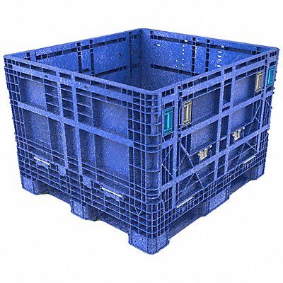 Collapsible Bulk Container Color Blue Container Wall Type Solid Folded Depth 48 in Folded Height 12 1/2 in Folded Width 44 1/2 in Fork Entry 4-Way Entry Fork Pockets Yes Maximum Operating Temperature 120 Degrees F Minimum Operating Temperature 0 Degrees F Mobility Stationary Number of Drop Doors 2 Overall Height 34 in Overall Length 48 in Overall Width 45 in Stackable Yes Stacking Capacity 1 800 lb Volume Capacity 28.9 cu ft Weight Capacity 2 000 lb Collapsible Yes