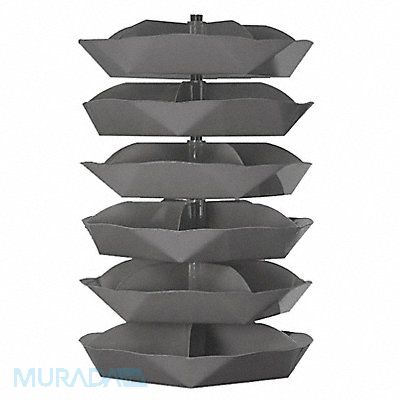 Revolving Storage Bin Gray Compartment Depth 19 1/2 in Compartment Height 9 3/4 in Compartment Width 26 1/2 in Level Design Scoop Bottom 625 lb Load Capacity per Level Number of Bins per Shelf 5 Steel Number of Levels 6 Gray Enamel Steel Shelf Diameter 44 in Overall Diameter 44 in Overall Height 69 1/2 in 2 500 lb Whole Unit Load Capacity Hardware
