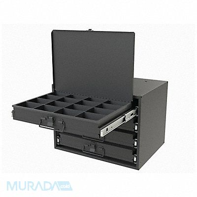Sliding Drawer Cabinet Box Width 18 in Compartment HxWxD (16) 2 in x 3 3/16 in x 2 3/16 in Frame Assembled Assembled Slide Type Bearing Box Height 3 in Cabinet Color Gray Number of Boxes 4 Number of Compartments 4 Overall Depth 11 7/8 in Overall Height 11 7/8 in Overall Width 15 5/8 in Stackable Yes Adjustable Dividers No Box Depth 12 in Box Handle Material Steel Box Handle Type Pull Cabinet Finish Powder Coated Cabinet Material Steel Compartment Width 3 1/4 in