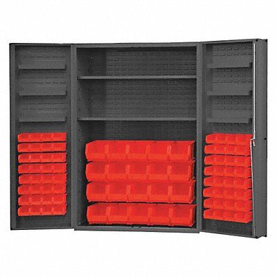 K4912 Bin Cabinet Base Type Frame Bin Color Red Bin HxWxD (20) 8 in x 15 in x 7 in (64) 4 in x 7 in x 3 in Cabinet Color Gray Cabinet Storage Components Bins Shelves Door Type Deep Box Frame Assembled Assembled Mobility Stationary Number of Bins 84 Number of Cabinet Bins 20 Number of Door Bins 64 Number of Shelves 8 Overall Depth 24 in Overall Height 72 in Overall Width 48 in Bin Depth 7 in 15 in Bin Height 3 in 7 in Bin Louvered Panel Location Door Bin Material Polypropylene