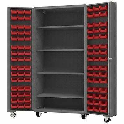 Heavy duty mobile bin cabinet Base Type Casters Bin Color Red Bin HxWxD (96) 3 in x 4 in x 5 in Cabinet Color Gray Cabinet Storage Components Bins Shelves Door Type Deep Box Frame Assembled Assembled Mobility Mobile Number of Bins 96 Number of Cabinet Bins 0 Number of Door Bins 96 Number of Shelves 4 Overall Depth 26 in Overall Height 76 1/4 in Overall Width 36 1/4 in Bin Depth 5 in Bin Height 3 in Bin Louvered Panel Location Door and Cabinet Back Bin Material Plastic