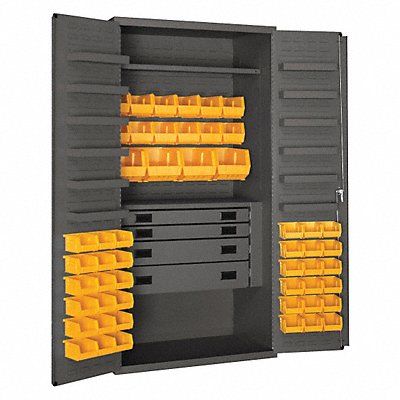 K4932 Bin Cabinet Base Type Frame Bin Color Yellow Bin HxWxD (12) 6 in x 11 in x 5 in (36) 4 in x 5 in x 3 in (4) 8 in x 15 in x 7 in Cabinet Color Gray Cabinet Storage Components Bins Drawers Shelves Door Type Flush Drawer Height 2 in 4 in 5 in Drawer Width 28 7/8 in Frame Assembled Assembled Mobility Stationary Number of Bins 52 Number of Cabinet Bins 16 Number of Door Bins 36 Number of Shelves 13 Overall Depth 24 in Overall Height 72 in Overall Width 36 in