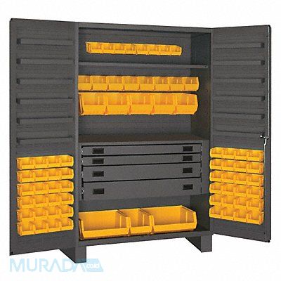 K4940 Bin Cabinet Base Type Legs Bin Color Yellow Bin HxWxD (2) 16 in x 15 in x 7 in (56) 4 in x 5 in x 3 in (6) 8 in x 15 in x 7 in (8) 6 in x 11 in x 5 in Cabinet Color Gray Cabinet Storage Components Bins Drawers Shelves Door Type Flush Drawer Height 3 in 5 in 6 in Drawer Width 40 7/8 in Frame Assembled Assembled Mobility Stationary Number of Bins 72 Number of Cabinet Bins 24 Number of Door Bins 48 Number of Shelves 13 Overall Depth 24 in Overall Height 78 in