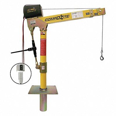 Davit Crane Kit Capacity 1 200 lb Reach 22 in to 66 in Lift Range 0 in to 540 in Yellow High Gloss Composite Operation Mode 12V DC Mast Diameter 3.57 in Swivel Angle 360 Degrees Includes 1/4 in x 540 in Galvanized Cable Assembly 12 Volt DC Brake Win Composite Davit Mounting Template Overload Protection Socket Base Test Certificate