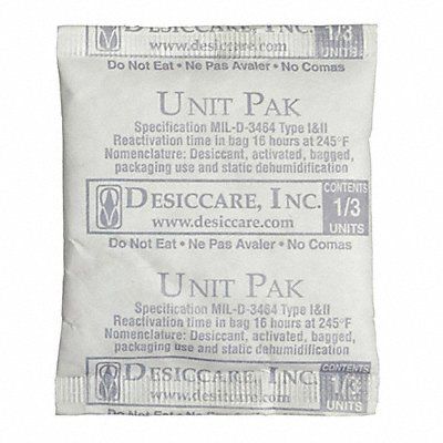 Desiccant Bag Desiccant Bag Type Tyvek(R) Bags Area Protected 0.03 cu ft Width 2 1/8 in Length 2 1/2 in Desiccant Bag Size 12 g Container Type Pail Plastic Bags per Package 700 Application Humidity Detection Material Montmorillonite Clay Color White Package Quantity 700