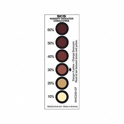 Humidity Indicator Card 6-Spots Desiccant Bag Type Karaft Bags Tyvek(R) Bags Width 1 9/16 in Length 4 3/4 in Desiccant Bag Size 36 g Container Type Can Humidity Indicator Form Card Number of Dots 6 Humidity Levels 10 Percent 20 Percent 30 Percent 40 Percent 50 Percent 60 Percent Indicators per Case 200 Application Measures the Level of Relative Humidity Exposed to Packaged Contents Material Blotter Paper Non-Cobaltous Solution Package Quantity 200