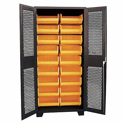 Bin Cabinet Base Type Legs Bin Color Yellow Bin HxWxD (18) 7 in x 16 1/2 in x 14 3/4 in Cabinet Color Black Cabinet Storage Components Bins Door Type Ventilated Frame Assembled Assembled Mobility Stationary Number of Bins 18 Number of Cabinet Bins 18 Number of Door Bins 0 Number of Shelves 0 Overall Depth 24 in Overall Height 78 in Overall Width 36 in Bin Depth 14 3/4 in Bin Height 7 in Bin Louvered Panel Location Cabinet Back Bin Material Plastic Bin Width 16 1/2 in