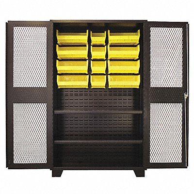 Bin Cabinet Base Type Legs Bin Color Yellow Bin HxWxD (4) 7 in x 8 1/4 in x 11 in (8) 7 in x 16 1/2 in x 14 3/4 in Cabinet Color Black Cabinet Storage Components Bins Shelves Door Type Ventilated Frame Assembled Assembled Mobility Stationary Number of Bins 12 Number of Cabinet Bins 12 Number of Door Bins 0 Number of Shelves 2 Overall Depth 24 in Overall Height 78 in Overall Width 48 in Vertical Shelf Clearance (2) 2 1/2 in Bin Depth 11 in 14 3/4 in Bin Height 7 in
