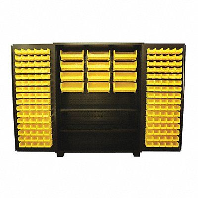 Bin Cabinet Base Type Legs Bin Color Yellow Bin HxWxD (12) 7 in x 16 1/2 in x 14 3/4 in (160) 3 in x 4 1/8 in x 7 1/2 in Cabinet Color Black Cabinet Storage Components Bins Shelves Door Type Flush Frame Assembled Assembled Mobility Stationary Number of Bins 172 Number of Cabinet Bins 12 Number of Door Bins 160 Number of Shelves 2 Overall Depth 24 in Overall Height 78 in Overall Width 60 in Vertical Shelf Clearance (2) 2 1/2 in Bin Depth 7 1/2 in 14 3/4 in