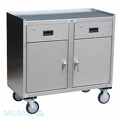 Mobile Cabinet Workbench Top Material Stainless Steel Color Silver Non-Metal Top Thickness Not Applicable Number of Doors 2 Number of Drawers 2 Number of Shelves 2 Overall Depth 27 in Overall Height 34 in Overall Load Capacity 1 200 lb Overall Width 37 in Top Metal Material Gauge 16 ga Included Components Drawers Upper Shelf Assembly Fully Assembled Brake Type None Cabinet Interior Depth 24 in Caster Mount Type Plate Caster Type (2) Rigid (2) Swivel Door Type Standard/Hinged
