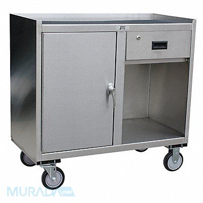 Mobile Cabinet Workbench Top Material Stainless Steel Color Silver Non-Metal Top Thickness Not Applicable Number of Doors 1 Number of Drawers 1 Number of Shelves 2 Overall Depth 27 in Overall Height 34 in Overall Load Capacity 1 200 lb Overall Width 37 in Top Metal Material Gauge 16 ga Included Components Drawers Upper Shelf Assembly Fully Assembled Brake Type None Cabinet Interior Depth 23 in Caster Mount Type Plate Caster Type (2) Rigid (2) Swivel Door Type Standard/Hinged