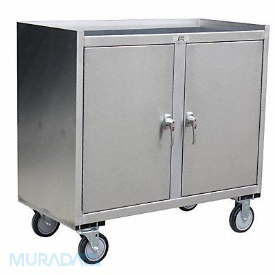 Mobile Cabinet Workbench Top Material Stainless Steel Color Silver Non-Metal Top Thickness Not Applicable Number of Doors 2 Number of Drawers 0 Number of Shelves 2 Overall Depth 21 in Overall Height 34 in Overall Load Capacity 1 200 lb Overall Width 37 in Top Metal Material Gauge 16 ga Included Components Upper Shelf Assembly Fully Assembled Brake Type None Cabinet Interior Depth 17 in Caster Mount Type Plate Caster Type (2) Rigid (2) Swivel Door Type Standard/Hinged