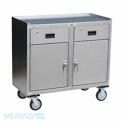 Mobile Cabinet Workbench Top Material Stainless Steel Color Silver Non-Metal Top Thickness Not Applicable Number of Doors 2 Number of Drawers 2 Number of Shelves 2 Overall Depth 21 in Overall Height 34 in Overall Load Capacity 1 200 lb Overall Width 37 in Top Metal Material Gauge 16 ga Included Components Drawers Upper Shelf Assembly Fully Assembled Brake Type None Cabinet Interior Depth 17 in Caster Mount Type Plate Caster Type (2) Rigid (2) Swivel Door Type Standard/Hinged