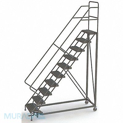 Configurable Rolling Ladder Material Steel Platform Height 100 in Handrails Included Yes Handrail Height 36 in Overall Height 136 in Number of Steps 10 Unassembled Load Capacity 450 lb Step Tread Serrated Platform Depth 17 in Platform Width 24 in Bottom Width 35 in Base Depth 99 in Overall Width 35 in Climbing Angle 50 Degrees Step Depth 8 1/2 in Step Width 24 in Ladder Actuation Foot Activated Step Lock Finish Powder Coated Color Gray Standards ANSI OSHA