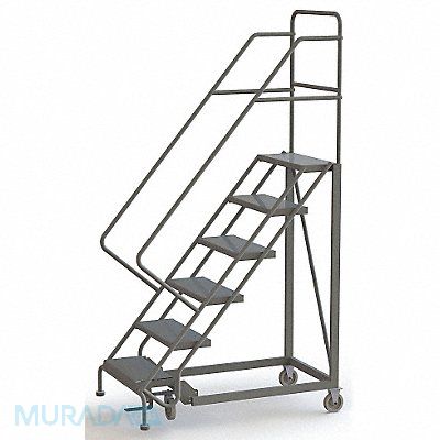 Configurable Rolling Ladder Material Steel Platform Height 60 in Handrails Included Yes Handrail Height 36 in Overall Height 96 in Number of Steps 6 Unassembled Load Capacity 450 lb Step Tread Perforated Platform Depth 17 in Platform Width 24 in Bottom Width 35 in Base Depth 66 in Overall Width 35 in Climbing Angle 50 Degrees Step Depth 8 1/2 in Step Width 24 in Ladder Actuation Foot Activated Step Lock Finish Powder Coated Color Gray Standards ANSI OSHA