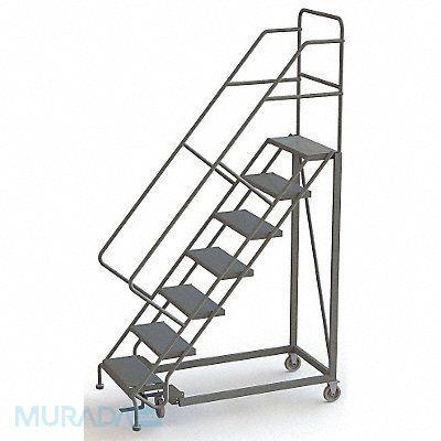Configurable Rolling Ladder Material Steel Platform Height 70 in Handrails Included Yes Handrail Height 36 in Overall Height 106 in Number of Steps 7 Unassembled Load Capacity 450 lb Step Tread Perforated Platform Depth 17 in Platform Width 24 in Bottom Width 35 in Base Depth 74 in Overall Width 35 in Climbing Angle 50 Degrees Step Depth 8 1/2 in Step Width 24 in Ladder Actuation Foot Activated Step Lock Finish Powder Coated Color Gray Standards ANSI OSHA