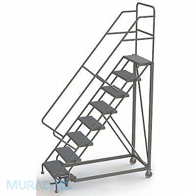 Configurable Rolling Ladder Material Steel Platform Height 80 in Handrails Included Yes Handrail Height 36 in Overall Height 116 in Number of Steps 8 Unassembled Load Capacity 450 lb Step Tread Perforated Platform Depth 17 in Platform Width 24 in Bottom Width 35 in Base Depth 82 in Overall Width 35 in Climbing Angle 50 Degrees Step Depth 8 1/2 in Step Width 24 in Ladder Actuation Foot Activated Step Lock Finish Powder Coated Color Gray Standards ANSI OSHA