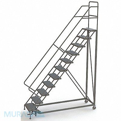 Configurable Rolling Ladder Material Steel Platform Height 110 in Handrails Included Yes Handrail Height 36 in Overall Height 146 in Number of Steps 11 Unassembled Load Capacity 450 lb Step Tread Perforated Platform Depth 17 in Platform Width 24 in Bottom Width 35 in Base Depth 107 in Overall Width 35 in Climbing Angle 50 Degrees Step Depth 8 1/2 in Step Width 24 in Ladder Actuation Foot Activated Step Lock Finish Powder Coated Color Gray Standards ANSI OSHA