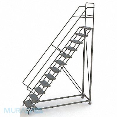 Configurable Rolling Ladder Material Steel Platform Height 120 in Handrails Included Yes Handrail Height 36 in Overall Height 156 in Number of Steps 12 Unassembled Load Capacity 450 lb Step Tread Perforated Platform Depth 17 in Platform Width 24 in Bottom Width 35 in Base Depth 116 in Overall Width 35 in Climbing Angle 50 Degrees Step Depth 8 1/2 in Step Width 24 in Ladder Actuation Foot Activated Step Lock Finish Powder Coated Color Gray Standards ANSI OSHA